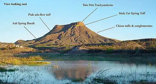 The mountain is composed of volcanic rock which formed 33–42 million years ago during the late Eocene Epoch. The volcanic rocks exposed at Tule Mountain in stratigraphic order are Chisos tuffs, Ash Spring Basalt, Chisos tuffs and conglomerates, Mule Ear Spring Tuff, and Tule Mountain Trachyandesite at the top which is dated at 33 Ma.[6]