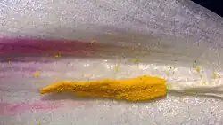Tulip stereoscope image demonstrating anther, filament, and petal. Pollen visible in background.