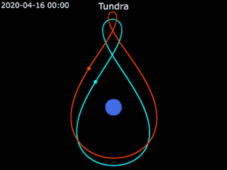 The ground track of a satellite in a Tundra orbit is a closed figure 8 with a smaller loop over either the northern or southern hemisphere.[1][2] This differentiates them from Molniya orbits designed to service high-latitude regions, which have the same inclination but half the period and do not loiter over a single region.[3][4]