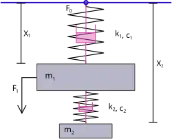 Given a motor with mass m1 attached via motor mounts to the ground, the motor vibrates as it operates and the soft motor mounts act as a parallel spring and damper, k1 and c1. The force on the motor mounts is F0. In order to reduce the maximum force on the motor mounts as the motor operates over a range of speeds, a smaller mass, m2, is connected to m1 by a spring and a damper, k2 and c2. F1 is the effective force on the motor due to its operation.