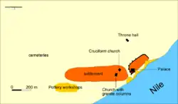 The city's heyday was in the ninth–eleventh centuries, but building activity lasted until the fourteenth century.[1] The Church of the Stone Pavements was replaced with the Cruciform Church at this time. Other buildings in use in Old Dongola at this time include many other churches, at least two palaces, and a sizable monastery on its north side. Several houses were well equipped and had bath rooms and wall paintings.