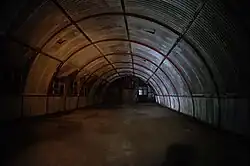 During the Cold War, the tunnels were adapted to provide protection against blast and heat flash from nearby atomic detonations. Blast traps were added to both pedestrian and vehicle entrances. The pedestrian blast traps were relatively simple, consisting of three blast walls overlapping by at least three-quarters of the width of the tunnel. A more elaborate approach had to be adopted for vehicle tunnels, where L-shaped entrances equipped with blast pockets were cut. The blast pockets were intended to absorb and reflect the blast wave, preventing it reaching far inside the tunnel complex. Gas locks were also installed to protect against contamination from the outside.[21]