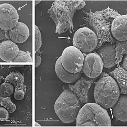 - ^ a b c d e Oliveira G, Silva L, Leão T, Mougari S, da Fonseca FG, Kroon EG, et al. (January 2019). "Tupanvirus-infected amoebas are induced to aggregate with uninfected cells promoting viral dissemination". Scientific Reports. 9 (1): 183. Bibcode:2019NatSR...9..183O. doi:10.1038/s41598-018-36552-4. PMC 6336878. PMID 30655573.