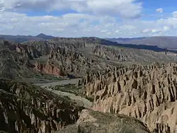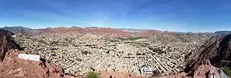 Tupiza is a city in Potosí Department, Bolivia. It is located at an elevation of about 2850 m. The population is 25,709 (2012 estimate). Tupiza and its environs are characterized by dramatic red escarpments which jut ruggedly skyward from the coarse, gray terrain; green agricultural land adjacent to the nearby Tupiza River provides welcome respite from the otherwise arid, thorny surroundings. The area quebradas are susceptible to flash flood runoff from sudden cloudbursts.[1]