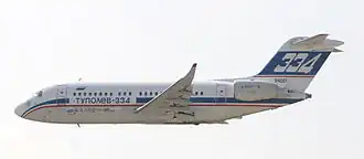 The Tupolev Tu-334 (Russian: Туполев Ту-334) was a Russian short-to-medium range airliner project that was developed to replace the aging Tupolev Tu-134 and Yak-42s in service around the world. The airframe was based on a shortened Tu-204 fuselage and a scaled-down version of that aircraft's wing. Unlike the Tu-204, however, the Tu-334 has a T-tail and engines mounted on the sides of the rear fuselage instead of under the wings. With the nationalisation of the Russian aircraft companies in 2009 to form United Aircraft Corporation it was decided not to continue with the programme.[1]