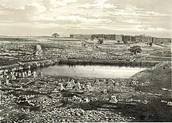 The cemetery shares its name with the Mamilla Pool, located at its center.[2] A church dedicated to "St Mamilla" was located at the same site in the early Byzantine and Islamic periods.[8][9][10]