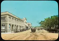 Over the years, the construction of Turbot Street underwent various changes. Edward Street intersecting with Turbot Street was altered ca. 1867.[15] In 1880, soil material from the road cutting of Ann Street was moved to Turbot Street between George and Roma Streets.[16] Another cutting of Turbot Street occurred in 1884.[17] By 1926 Turbot Street had extended from its original North Quay—Albert Street length, to Edward and Upper Edward Streets, a change from 0.385 kilometres (0.239 mi) to 0.600 kilometres (0.373 mi) long.[18]