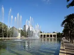 The Jardín del Turia is a public urban park located in the former riverbed of the Turia River in the city of Valencia, Spain. The park spans approximately 136 hectares, with plans to expand to 160.5 hectares in the future. It stretches nearly 8.5 kilometers in length, which will extend to almost 10 kilometers upon completion of the final section, with an average width of about 160 meters. It is one of the largest purely urban gardens in Spain.
