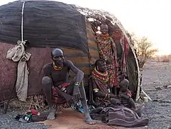 Houses are constructed over a wooden framework of domed saplings on which fronds of the doum palm (Hyphaene thebaica), hides or skins, are thatched and lashed on. The house is large enough to house a family of six. Usually, during the wet season, they are elongated and covered with cow dung. Animals are kept in a brushwood pen. Due to changes in the climatic conditions, most Turkana has started changing from the traditional method of herding cattle to agro-pastoralism.
