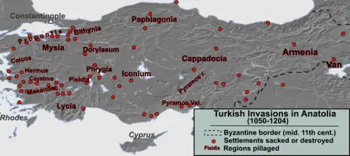 Settlements and regions affected during the first wave of Turkish invasions in Asia Minor (11th–13th century). In the ten years following the Battle of Manzikert in 1071, the Seljuk Turks from Central Asia migrated over large areas of Anatolia.