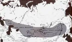 The precise date of the initial expansion from the early homeland remains unknown. The first state known as Turk, giving its name to the many states and peoples afterward, was that of the Göktürks (gök 'blue' or 'celestial', however in this context gök refers to the direction 'east'. Therefore, Gökturks only denoted the Eastern Turks in the 6th century. In 439, the head of the Ashina clan led his people from Pingliang (now in modern Gansu province, China) to the Rouran seeking inclusion in their confederacy and protection.[19] His tribe consisted of famed metalsmiths and was granted land near a mountain quarry that looked like a helmet, from which they got the name Turk/Tujue 突厥.[20][21][22] In 546, the leader of the Ashina, Bumin, aided the Rouran in putting down a Tiele revolt. Bumin requested a Rouran princess for his service but was denied, after which he declared independence. In 551, Bumin declared himself Khagan and married Princess Changle from Western Wei. He then dealt a serious blow to the Rouran Khaganate the next year, but died soon after. His sons, Issik Qaghan and Muqan Qaghan, continued to wage war on the Rouran, finishing them off in 554. By 568, their territory had reached the edges of the Byzantine Empire, where the Avars, possibly related to the Rouran in some fashion, escaped.[23] In 581, Taspar Qaghan died and the khaganate entered a civil war that resulted in two separate Turkic factions. The Eastern Khaganate was defeated by the Tang dynasty in 630 while the Western Khaganate fell to the Tang in 657. In 682, Ilterish Qaghan rebelled against the Tang and founded the Second Turkic Khaganate, which fell to the Uyghurs in 744.[24]
