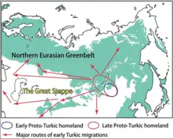 1. ^ a b Yunusbayev, Bayazit; Metspalu, Mait; Metspalu, Ene; Valeev, Albert; Litvinov, Sergei; Valiev, Ruslan; Akhmetova, Vita; Balanovska, Elena; Balanovsky, Oleg (2015-04-21). "The Genetic Legacy of the Expansion of Turkic-Speaking Nomads across Eurasia". PLOS Genetics. 11 (4): e1005068. doi:10.1371/journal.pgen.1005068. ISSN 1553-7390. PMC 4405460. PMID 25898006. The origin and early dispersal history of the Turkic peoples is disputed, with candidates for their ancient homeland ranging from the Transcaspian steppe to Manchuria in Northeast Asia,