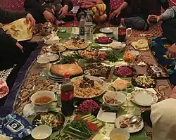 Pilaf (Turkmen: palaw) is served at celebrations and to honored guests; one source calls it "king in Turkmen cuisine."[14] It consists of rice typically cooked with chunks of mutton and carrots, onions, and garlic, prepared in a large cast-iron cauldron. Different pilaf recipes may call for addition of raisins (Turkmen: kişmiş), fruits, fish, and ground meat.[3] Pilaf is traditionally eaten with the hands.
