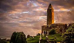 In the ninth century an unusual low and squat round tower was constructed at the site.[5]