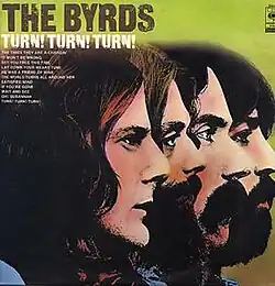 Turn! Turn! Turn! is the second studio album by the American rock band the Byrds, released on December 6, 1965, by Columbia Records.[1] Like its predecessor, Mr. Tambourine Man, the album epitomized the folk rock genre and continued the band's successful mix of vocal harmony and jangly twelve-string Rickenbacker guitar.[2] The album's lead single and title track, "Turn! Turn! Turn!", which was adapted by Pete Seeger from text in the Book of Ecclesiastes, had previously been arranged in a chamber-folk style by the Byrd's lead guitarist Jim McGuinn for folk singer Judy Collins' third album,[3] but the arrangement he used for the Byrds' recording of the song utilizes the same folk-rock style as the band's previous hit singles.[4]