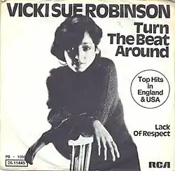 "Turn the Beat Around" is a disco song written by Gerald Jackson and Peter Jackson, and performed by American actress and singer Vicki Sue Robinson in 1976 (see 1976 in music), originally appearing on her debut album, Never Gonna Let You Go (1976). Released as a single in February 1976 by RCA Victor, the song went to number ten on the US Billboard pop charts, and number 73 on the Billboard soul chart.[1] The song earned Robinson a Grammy nomination for Best Female Pop Vocal Performance. The track also went to number one on the Billboard disco chart for four weeks.[2] "Turn the Beat Around" is considered a disco classic and is featured on many compilation albums. In 2000, VH1 ranked it number 30 in their list of "100 Greatest Dance Songs".[3]