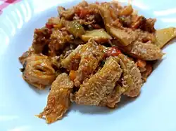 Pork is also produced.[4] The region is well-known also for its rich game, especially wild boar, hare, fallow deer, roe deer, and pheasant that often are used to prepare pappardelle dishes. Maiale Ubriaco, or "Drunken Pork", is another regional preparation in which pork is braised in Chianti wine and often paired with Tuscan kale.[5] Lardo is a salume of cured fatback, served as thin slices or as a paste; a famous variety is lardo di Colonnata.