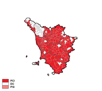 The Italian Communist Party was by far the largest party. After the election Gianfranco Bartolini, the incumbent Communist President of the Region, formed a new government with the support of the Italian Socialist Party and the Italian Democratic Socialist Party.[1]