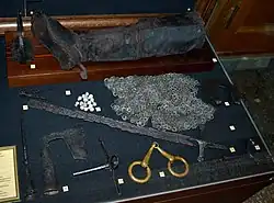 In 1898, during the construction of the Moscow–Vindavskaya (now Riga) Railway, many finds were made near Tushino. The excavations were carried out by the engineer–traveler Politkovsky under the scientific supervision of Academician Zabelin. As a result, a collection of 560 items was collected, donated to the Imperial Historical Museum, where it is still partly on display (in particular, you can see kernels, "garlic" – sharp thorns that were thrown at the feet of horses, and Polish boot with a spur). Samples of weapons are of particular interest: barrels of arquebuses, a bullet, several bardiches and axes, spears, as well as horse comb, shishaks, chain mails, shells. Also tools and household items were found: scythes, sickles, chisels, axes, armchairs, scissors, finally utensils: doorknobs, beads and locks, both hinged and internal, tiles, and finally a large number of coins, both Polish and coins of "Tsar Dmitry Ivanovich" minted in Tushino. The items found were charred, which confirmed reports of the burning of Tushino.