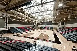 The sports pavilion was finished in 2012, costing $22 million. It seats 2,500 students and faculty within 29,000 square feet of space. Amenities include ticket windows, concession stands, foyer, dance room, trophy cases, men's and women's team rooms equipped with smart boards, two professionally sized scoreboards, and a drop-down display screen. The new facility houses four-sided bleachers and can be formatted as three basketball or volleyball practice courts (width-wise), a college-sized basketball court, or a main volleyball court (length-wise).