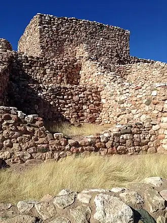 Tuzigoot National Monument (Yavapai: ʼHaktlakva, Western Apache: Tú Digiz) preserves a 2- to 3-story pueblo ruin on the summit of a limestone and sandstone ridge just east of Clarkdale, Arizona, 120 feet (37 m) above the Verde River floodplain. The Tuzigoot Site is an elongated complex of stone masonry rooms that were built along the spine of a natural outcrop in the Verde Valley. The central rooms stand higher than the others and they appear to have served public functions.[3] The pueblo has 110 rooms.[4] The National Park Service currently administers 58 acres (23 hectares), within an authorized boundary of 834 acres (338 hectares).[5]