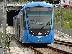 Tvärbanan is served by tram types designated A32 and A35. The A32, Flexity Swift from Bombardier, began operating on Tvärbanan in 1999. The A35, Urbos AXL from CAF was introduced in connection with the extension to Solna in October 2013.[12] Both types are approximately 30 meters long and have 72–78 seats each, with two trams usually coupled to increase capacity, leading to a train of around 60 meters long.[13][14] This compares to the 140 meter metro trains and the 214 meter commuter trains.