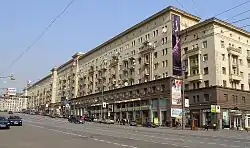 Towards the end of the 19th century, the street was reconstructed, with stately neoclassical mansions giving way to grandiose commercial buildings in an eclectic mixture of historical styles. A characteristic edifice of the time is the eclectic Hotel National, Moscow (1901-1903), whose interior is a landmark of Russian Art Nouveau. In 1888 the actor, theatre director and founder of the Moscow Art Theatre, Constantin Stanislavski, rented the Ginzburg House on the street and had it converted into a luxurious clubhouse with its own large stage and several exhibition rooms, in order to house his newly formed Society of Art and Literature.[2] The Society gave its last performance there on 3 January 1891 and the building burnt down on the night of January 10.[3]