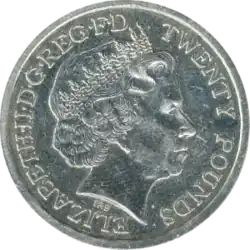 The British twenty pound (£20) coin is a commemorative denomination of sterling coinage, first issued by the Royal Mint in 2013.[1] It is minted in .999 fine silver.[2] Twenty pound coins are legal tender[3] but are intended as souvenirs and are almost never seen in general circulation.