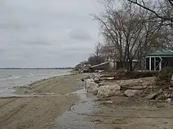 Twin Lakes Beach has been the recipient of many storms causing shoreline erosion, flooding and property damage. Most notably are the storms of the fall of 1999, especially the storm on November 1 [1], as well as the fall of 2010 [2] "weather bomb" both of which involved wind gusts of over 100 km/h and high winds for an extended period of time with the result being a shift in the lake of water from the north basin of Lake Manitoba to the south basin of the lake and large waves. Both storms resulted in considerable shoreline erosion, property damage, and some flooding. The 1999 storm caused an estimated $1 million in damage and was a catalyst for establishing new regulation of lake levels.[5] Also in 1981 and 1992 cottages were destroyed as a result of shoreline ice pile-up. On July 29, 2012 a thunderstorm occurred at Twin Lakes Beach causing widespread damage to property including complete destruction of homes due to heavy rain, hail, and plow winds with gusts up to 150 km/h recorded on radar.[16][17]