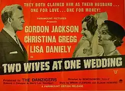 Two Wives One Wedding is a low budget 1961 British crime film directed by Montgomery Tully and starring Gordon Jackson, Christina Gregg, and Lisa Daniely.[1][2] It was written by Brian Clemens and Eldon Howard and produced by The Danzigers.