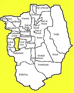 ![]() Location of Twomileborris within the civil parishes of north Tipperary, showing the enclave of Ballymoreen | |