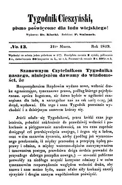 ![]() Front page of Tygodnik Cieszyński, 31 March 1849 | |