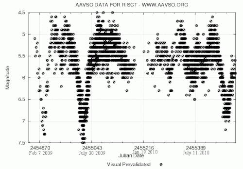 RV Tau stars in particular show irregularities in their light curves, with slow variations in the brightness of both maxima and minima, variations in the period, intervals with little variation, and sometimes a temporary breakdown into chaotic behaviour. R Scuti has one of the most irregular light curves.