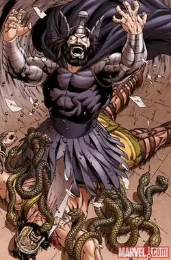 In the Dark Reign storyline, Typhon was freed from the underworld by Hera with the promise of getting to kill some Olympians. During the Trial of Zeus he acts as one of the Jury of 501 of Zeus's enemies. He participated in Hera's attack on Hercules, Amadeus Cho, and Athena only for both groups to be attacked by the Dark Avengers.[7] Subsequently, he appeared as a witness at the trial of Zeus in Hades, accusing him of the genocide of Typhon's race of monsters.[8] Later, it was revealed that he is sexually involved with Hera.[9]