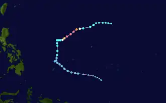 - ^ A super typhoon is an unofficial category used by the Joint Typhoon Warning Center (JTWC) for a typhoon with winds of at least 240 km/h (150 mph).[23]
