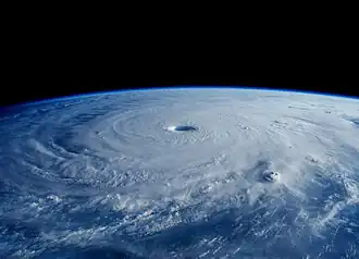On March 28, microwave satellite imagery revealed an eye with central dense overcast obscuring most of the feature;[10] accordingly, the JMA upgraded Maysak to a severe tropical storm.[6] The storm continued to strengthen while moving westward along the periphery of a subtropical ridge,[10] The eye became more defined and the convection became more consolidated.[11] Early on March 29, the JMA upgraded Maysak further to typhoon status, estimating 10 minute winds of 120 km/h (75 mph).[6] That day, the typhoon moved over Chuuk Lagoon, the first time an eye crossed the lagoon since Typhoon Amy in 1971.[12][13] The storm developed good outflow, enhanced by a strong northerly flow,[14] although moderate wind shear kept Maysak from intensifying more quickly.[15] However, the eye became clearly visible on March 30,[16] and the typhoon rapidly intensified after the shear diminished.[17] The JTWC reported a 30 km (19 mi) wide eye displaying the stadium effect, and surrounded by very deep convection. On March 31, the agency assessed that Maysak intensified into a Category 5-equivalent super typhoon on the SSHWS, with 1-minute sustained winds of 260 km/h (160 mph); this was increased to 280 km/h (175 mph) in post-season reanalysis, the highest on record for a pre-April typhoon.[18] Around that time, the storm was moving through the Federated States of Micronesia (FSM), passing just north of Fais Island,[19] and also very near Ulithi.[18] Late on March 31, Maysak reached its peak intensity, and the JMA estimated peak winds of 195 km/h (120 mph) and a minimum pressure of 910 mbar (27 inHg),[6] although operationally, the agency had estimated that Maysak was slightly more intense.[20] This made Maysak the most powerful typhoon ever recorded before April, surpassing Typhoon Mitag of 2002, Typhoon Alice of 1979, and Typhoon Harriet of 1959.[18]