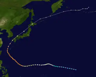 Typhoon Mireille, known in the Philippines as Super Typhoon Rosing, was the costliest typhoon on record, until it was surpassed by Typhoon Doksuri in 2023.[1] Striking Japan in September 1991, it became the 20th named storm of the 1991 Pacific typhoon season, Mireille formed on September 13 from the monsoon trough near the Marshall Islands. It moved westward for several days as a small system, steered by the subtropical ridge to the north. The storm rapidly intensified to typhoon status on September 16, and several days later passed north of Saipan in the Northern Marianas Islands. Mireille intensified further after deleterious effects from a nearby tropical storm subsided. On September 22, the American-based Joint Typhoon Warning Center (JTWC) estimated maximum 1-minute sustained winds of 240 km/h (150 mph), and on the next day, the official Japan Meteorological Agency (JMA) estimated 10‑minute sustained winds of 185 km/h (115 mph). The typhoon weakened slightly while turning northward, passing just east of Miyako-jima and later to the west of Okinawa. On September 27, Mireille made landfall near Nagasaki in southwestern Japan with winds of 175 km/h (109 mph), the strongest since Typhoon Nancy in 1961. The storm accelerated to the northeast through the Sea of Japan, moving over Hokkaido before becoming extratropical on September 28. The remnants of Mireille continued to the east, passing through the Aleutian Islands of Alaska on October 1.