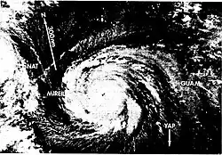 Only 12 hours after the JTWC issued the first warning, Mireille attained typhoon status at 12:00 UTC on September 16, and several hours later reached an initial peak intensity of 135 km/h (84 mph).[2][6] The small storm moved west-northwestward due to the influence of the subtropical ridge to the north. On September 17, the track shifted to the west-southwest, threatening Guam. The small typhoon turned more to the west, passing about 20 km (12 mi) north of Saipan on September 19, part of the Northern Marianas Islands north of Guam. For several days, Mireille failed to intensify due to wind shear from the larger Tropical Storm Luke to the north. After Luke weakened and progressed northward, Mireille was able to strengthen more gradually, as well as increase in size.[2] On September 22, the typhoon strengthened into a super typhoon, which is an unofficial category used by the JTWC for storms reaching 1‑minute winds of at least 240 km/h (150 mph), equivalent to a strong Category 4 hurricane on the SSHWS.[6] According to the JMA, Mireille attained 10‑minute winds of 185 km/h (115 mph) on September 23.[4]