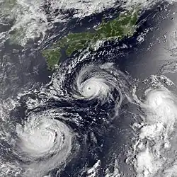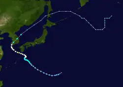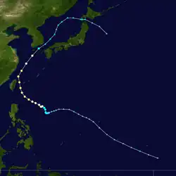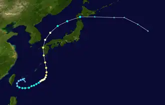 Typhoon Pat developed from the Monsoon Trough situated to the east of Taiwan on August 27. Pat quickly was upgraded to tropical storm status and was named. Due to a probable Fujiwhara Interaction between Pat and Typhoon Odessa, Pat moved toward the northeast. Just before making a turn towards the northwest Pat was upgraded to a typhoon on the 28th. Typhoon Pat began to accelerate in the direction of Japan. Pat made landfall on southern Kyūshū on the 30th before accelerating through the Sea of Japan and turning extratropical. Pat killed 23 people through Kyūshū and Hokkaidō and destroyed 3,000 homes.[13]