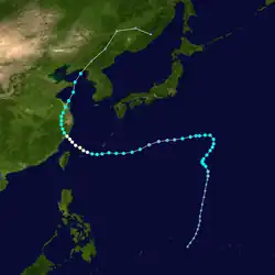 On August 15, a tropical depression formed from the monsoon trough a short distance of northern Taiwan. It headed northeastward, becoming a tropical storm later that day. The building of the subtropical ridge to its east forced Mamie northwestward, where it became a typhoon on August 17. On August 18, the typhoon hit near Shanghai, China, and paralleled the east coast of China. The storm turned to the northeast, hit near Dairen, China, and dissipated on August 20. Mamie was responsible for 44 fatalities and heavy crop damage.[10] Total damage amounted to US$13.7 million (1985 dollars).[1]