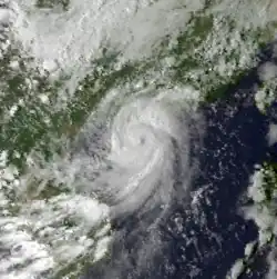 Typhoon Kit was the first of seven tropical cyclones to form in the West Pacific in August. It formed from a disturbance at the north end of a monsoon trough. The disturbance quickly gained organization and formed into a tropical depression on August 2. The storm moved steadily to the northwest and steadily intensified. The depression became Tropical Storm Kit on August 4. The storm became a typhoon as it made a temporary jog to the north before continuing its northwest motion. The typhoon, small in size, reached its peak intensity of 85 knots (98 mph; 157 km/h) while south of Kyūshū on August 8. Kit recurved in the East China Sea in the face of an approaching trough which caused a weakness in the subtropical ridge. Kit made landfall on the south-western tip of South Korea as a weak typhoon. The storm killed twelve people from resultant flooding and caused significant property damage on Cheju Island and the southern coast of South Korea. Kit became an extratropical cyclone in the Sea of Japan.[2] A total of US$3.7 million (1985 dollars) of damage were caused by Kit across South Korea and Japan.[1]