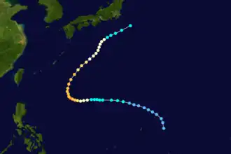 Continuing to intensify, Typhoon Orchid tracked due westward south of subtropical ridge.[1] Late on October 6, the JTWC raised the intensity of the storm to 185 km/h (115 mph), equal to a Category 3 hurricane on the United States-based Saffir-Simpson Hurricane Wind Scale (SSHWS).[7] Increased convergence in the southern quadrant enhanced convection, and dual outflow channels aloft were present.[1] The next day, the JTWC and JMA estimated that Orchid attained its peak intensity of 210 km/h (130 mph)[1] and 175 km/h (110 mph).[2] Shortly after its peak, Orchid began to recurve near 130°E as the ridge receded eastward, allowing Orchid to move north. Typhoon Orchid slowly accelerated after recurvature, only to slow down south of Japan on October 10 as a binary interaction started with Typhoon Pat. Over a 42-hour period from October 10–12, Orchid took a "stair-stepped" track - moving to the north then back to the northeast due to interaction with Typhoon Pat.[1] At 00:00 UTC on October 12, both the JTWC and JMA agreed that Pat lost typhoon intensity.[5] Orchid subsequently started speeding up, following Pat to the northwest while slowly weakening. At 00:00 UTC on October 13, the final warning was issued by the JTWC since Orchid had transitioned into an extratropical cyclone,[1] though according to the JMA, this process did not occur until 24 hours later.[2] The JMA stopped keeping an eye on the system late on October 15.[5]