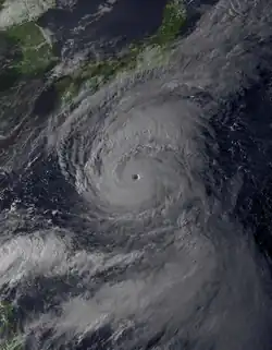 Typhoon Oscar reached its maximum intensity of high winds with 260 kilometres per hour (160 miles per hour) and a minimum central pressure of 925 millibars (hPa; 27.32 inHg) on September 14. The eye was well-developed, and it headed towards Japan.