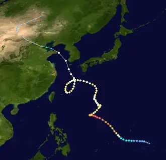 - ^ Total deaths include direct and indirect effects. The 377 fatalities include 242 flood-related in the Philippines; 50 storm-related in China; 45 disease-related in the Philippines; 33 storm-related in South Korea; 3 storm-related in Taiwan; 3 storm-related in the Ryukyu Islands; 1 storm-related offshore