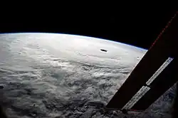 Once Typhoon Vongfong entered the Philippine Area of Responsibility shortly after 06:00 UTC on October 7, the PAGASA named it Ompong.[6] The system started to undergo rapid deepening early on that day, owing to low vertical wind shear and multiple outflow mechanisms including a TUTT cell positioned to the east. The JTWC upgraded it to a super typhoon at noon, as the system had formed a 40 km (25 mi) round eye surrounded by a symmetric annulus of intense convection.[7] Vongfong reached peak intensity six hours later, when the system's T-number of the Dvorak technique had increased to 7.5 according to both of the JMA and the JTWC, becoming the first tropical cyclone to reach that status since Haiyan in 2013. As the result, the JMA indicated that the maximum ten-minute sustained winds had increased to 215 km/h (134 mph) and the system's atmospheric pressure had dropped to 900 hPa (27 inHg).[8] The JTWC also indicated that Vongfong had become equivalent to a Category 5 hurricane on the Saffir–Simpson hurricane wind scale, with maximum one-minute sustained winds at 285 km/h (177 mph). Additionally, although the typhoon was still generally tracking westward, it noticeably slowed down due to the weakening subtropical ridge.[26]