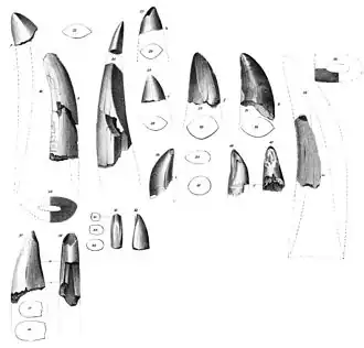 The first remains of tyrannosaurids were uncovered during expeditions led by the Geological Survey of Canada, which located numerous scattered teeth. These distinctive dinosaur teeth were given the name Deinodon ("terrible tooth") by Joseph Leidy in 1856. The first good specimens of a tyrannosaurid were found in the Horseshoe Canyon Formation of Alberta, and consisted of nearly complete skulls with partial skeletons. These remains were first studied by Edward Drinker Cope in 1876, who considered them a species of the eastern tyrannosauroid Dryptosaurus. In 1905, Henry Fairfield Osborn recognized that the Alberta remains differed considerably from Dryptosaurus, and coined a new name for them: Albertosaurus sarcophagus ("flesh-eating Alberta lizard").[5] Cope described more tyrannosaur material in 1892, in the form of isolated vertebrae, and gave this animal the name Manospondylus gigas. This discovery was mostly overlooked for over a century, and caused controversy in the early 2000s when it was discovered that this material actually belonged to, and had name priority over, Tyrannosaurus rex.[6]