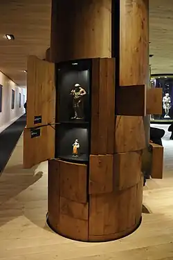 The Giant Panoramic Painting, that was transferred here in September 2010,[1] is the main exhibit of the museum. It depicts the Tyrolean Rebellion of 1809 on 1,000 square metres of canvas. Another focal point of the Tyrol Panorama is the permanent exhibition called the “Tyrolean Stage” ("Schauplatz Tirol"). Here, the themes of religion, nature, politics and man will be used to explain the "Tyrolean myth" by using exhibits. Furthermore, the new house is connected underground to the Kaiserjäger Museum, which is a "museum within the museum". The exhibition area is visually divided into four thematic areas. “Nature” is presented in a 40-metre-long showcase in which, among other things, a cable car gondola and stuffed animals, such as a bear and a beaver, are exhibited. “Politics" is located in the middle of the room, where, for example, the horse's head of the so-called "Aluminum Duce" monument in Bolzano or the valuable 1511 ‘’Landlibell’’ of Emperor Maximilian I are found. Interactive "tree trunks" show the "man" or "Tyrolean types". Here you can also find, for example, the pipe of former provincial governor, Eduard Wallnöfer, or a self-portrait of the painter, Anna Stainer-Knittel. The exhibits on "Religion" are housed in large glass showcases at the back of the main entrance foyer to the Kaiserjäger Museum. Among other things, a baroque pulpit and fresco designs from St. Theresa’s Church by Max Weiler are displayed here. Weiler mural of the “Archduke Ferdinand II and Philippine Welser at Schloss Ambras“ was transported to the Tyrol Panorama on 21 February 2011, where it hangs in the restaurant. From 1953 to 2000 the painting was hung in the dining room of the old Hotel Tyrol in Innsbruck.[2] The painting weighs a tonne, is 28 square metres in area and was painted in 24 individual sections.[3]