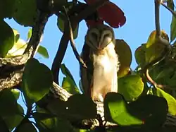 The American barn owl is a medium-sized, pale-coloured owl with long wings and a short, squarish tail.[4] However, the largest-bodied race of barn owl, T. f. furcata from Cuba and Jamaica, is also an island race, albeit being found on more sizeable islands with larger prey and few larger owls competing for dietary resources.[5] The shape of the tail is a means of distinguishing the barn owl from typical owls when seen in the air. Other distinguishing features are the undulating flight pattern and the dangling, feathered legs. The pale face with its heart shape and black eyes give the flying bird a distinctive appearance, like a flat mask with oversized, oblique black eye-slits, the ridge of feathers above the beak somewhat resembling a nose.[6]
