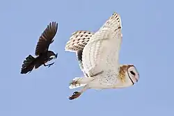 Predators of the barn owl include large American opossums (Didelphis), the common raccoon, and similar carnivorous mammals, as well as eagles, larger hawks and other owls. Among the latter, the great horned owl (Bubo virginianus) is a noted predator of barn owls. Despite some sources claiming that there is little evidence of predation by great horned owls, one study from Washington found that 10.9% of the local great horned owl's diet was made up of barn owls.[16][17][18]