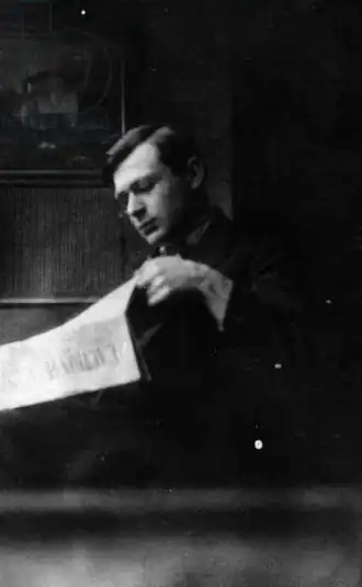 He moved to Bucharest at the age of eleven, and attended the Schemitz-Tierin boarding school.[9] It is believed that the young Tzara completed his secondary education at a state-run high school, which is identified as the Saint Sava National College[9] or as the Sfântul Gheorghe High School.[11] In October 1912, when Tzara was aged sixteen, he joined his friends Vinea and Marcel Janco in editing Simbolul. Reputedly, Janco and Vinea provided the funds.[12] Like Vinea, Tzara was also close to their young colleague Jacques G. Costin, who was later his self-declared promoter and admirer.[13]